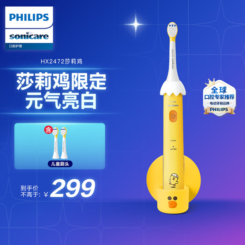 飞利浦(PHILIPS)儿童电动牙刷LINE FRIENDS合作款莎莉鸡限定适用4-6-12岁 2种柔护模式 自带2支刷头挂式底座HX2472价格:339.00元!