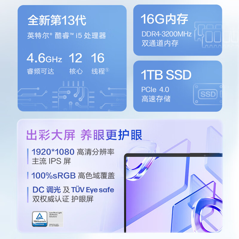 1、集成显卡弱一点,其他都还可以,办公足够了没有键盘背光灯真是太可惜了,底部平坦散热没有问题,但我还是加了小垫块以加大底部间隙,运行速度对办公已经足够,Wifi6下载特别快可以达到15M左右,蓝牙可以同时连接多个设备,喇叭音效也不错,4K的价格还是值得的