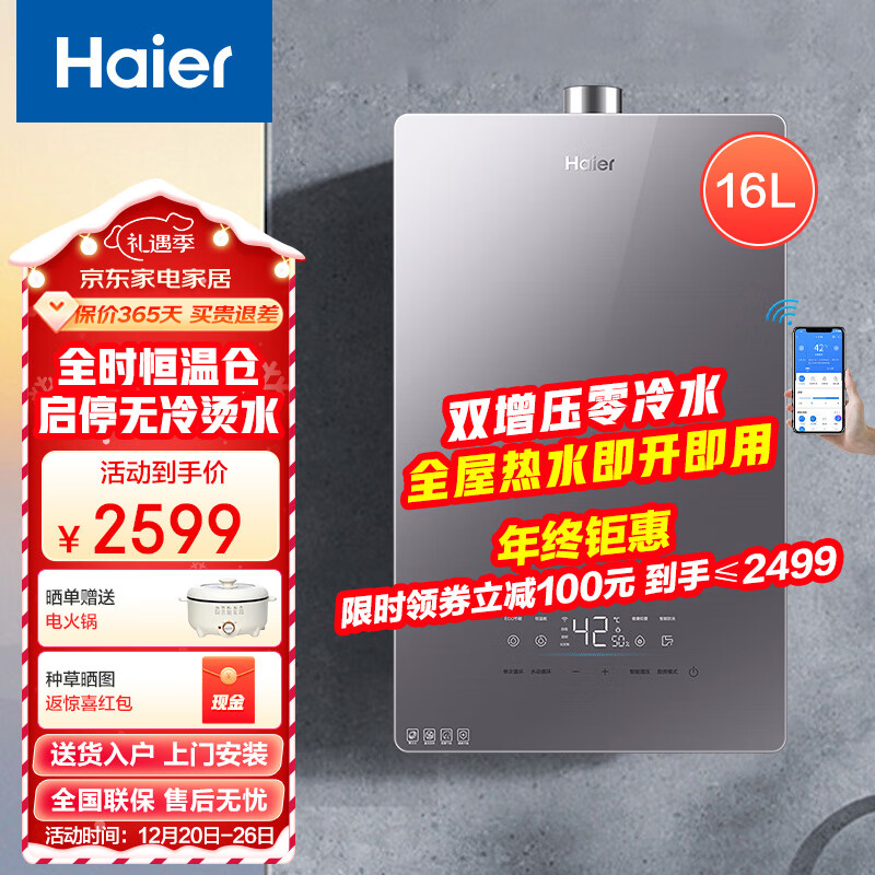 海尔(Haier)燃气热水器 16升双增压零冷水 全时恒温仓 强排式家用节能天然气热水器JSQ30-16TK3BDU1[家电]价格:2599.00元!