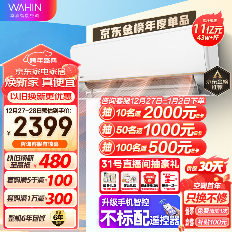 3、华凌空调,美的子品牌空调,配置高,可以用手机控制,查看电量。回家前就可以开启,出远门也可以用手机关闭,免得造成浪费。新一级能耗,节能省电小能手,京东品质,以旧换新,性价比更好。非常好。