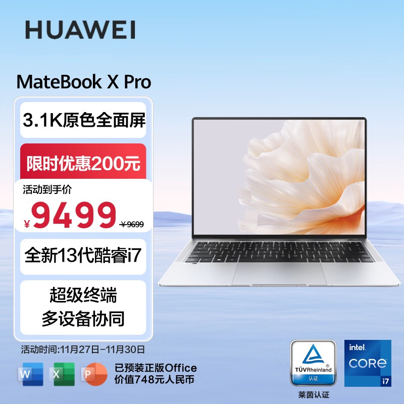 华为笔记本电脑MateBook X Pro 2023 英特尔Evo 13代酷睿i7 16G 1T 14.2英寸3.1K触控屏/商务轻薄本/手机互联 银价格:9499.00元!