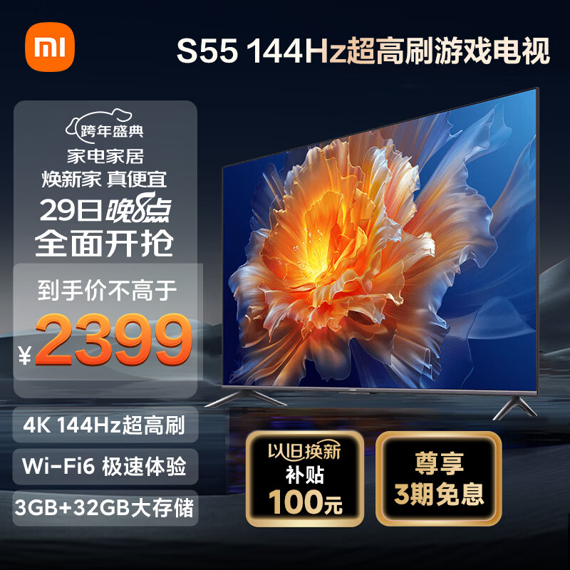 小米电视S55 55英寸4K144Hz超高刷全速旗舰游戏电视WiFi63GB+32GB金属屏智能电视L55M9-S以旧换新价格:2399.00元!