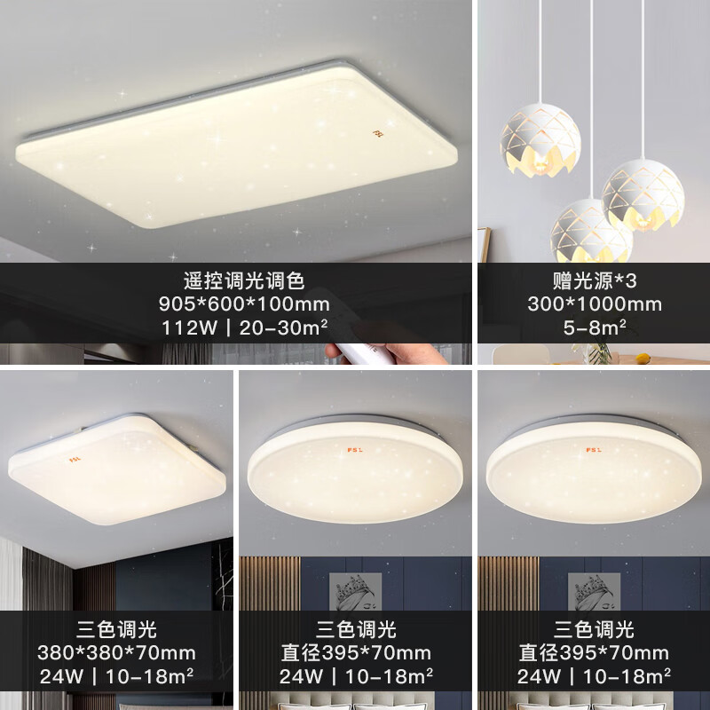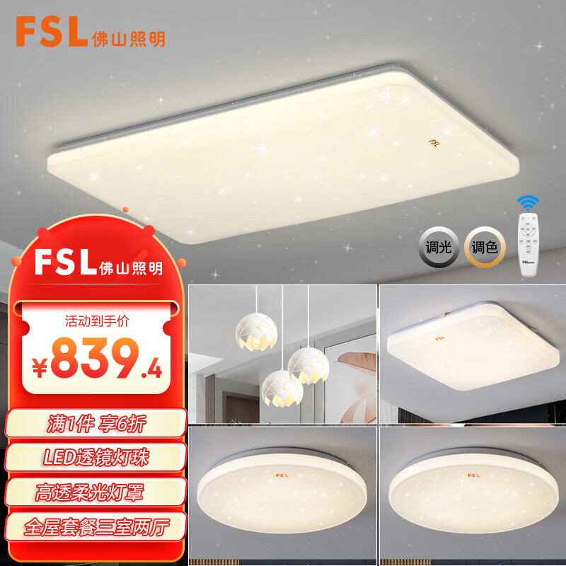 FSL佛山照明灯具套餐LED吸顶灯智能客厅卧室灯遥控调色三室两厅54060价格:1399.00元!