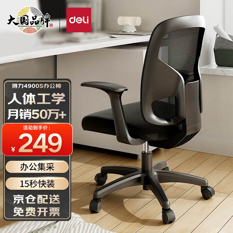 得力(deli)4900S 人体工学靠背办公椅/电脑椅/职员椅 家用网布可升降转椅 黑价格:219.30元!