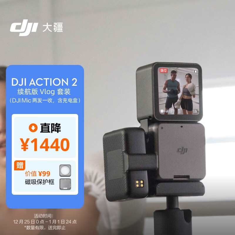 大疆 DJI Action 2 续航版 Vlog 套装(DJI Mic 一拖二) 灵眸防抖运动相机 高清小型vlog手持摄像机价格:3757.90元!