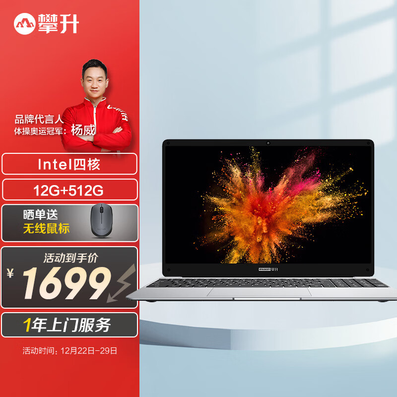 攀升【杨威推荐】2023款P1X英特尔四核15.6英寸低蓝光高性能笔记本电脑游戏大学生网课设计学习办公手提轻薄本价格:1699.00元!