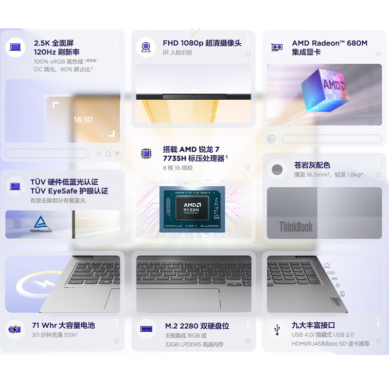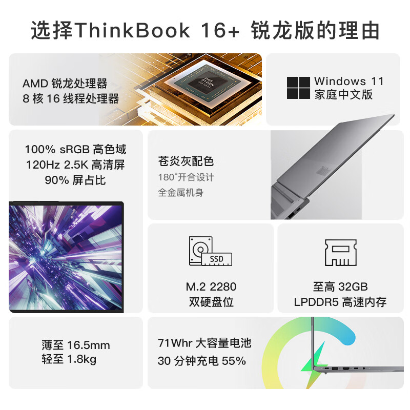 ThinkPad联想ThinkBook 16+ 2023 AMD锐龙标压笔记本电脑 16英寸标压轻薄办公本R7-7735H 16G 512G SSD 2.5K 120Hz价格:4999.00元!