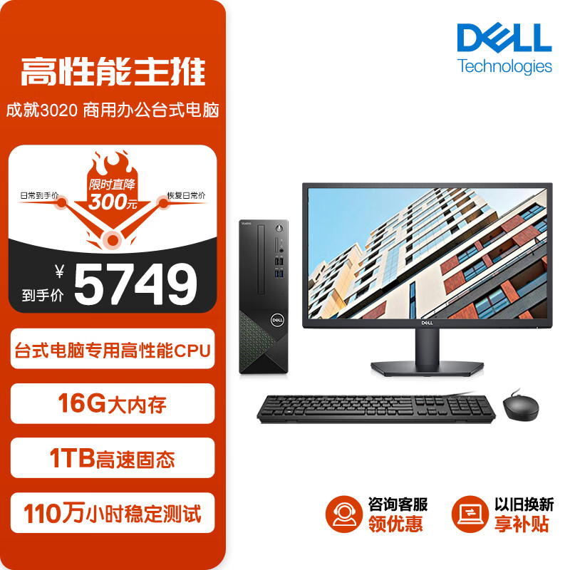 戴尔(Dell)成就3020 台式电脑主机 高性能整机 (13代i7-13700 16G 1TBSSD三年上门)21.5英寸显示器价格:5749.00元!