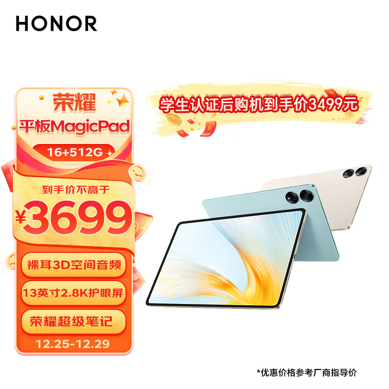 荣耀平板MagicPad 13英寸 8扬声器 144Hz高刷护眼 2.8K超清 移动办公影音娱乐平板 WIFI 16GB+512GB 天青色价格:3699.00元!