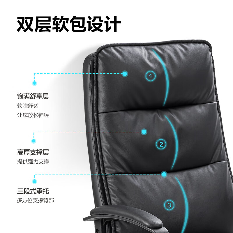 1、外观样式:大气简洁,家用很合适,小房间用略大。产品质量:椅子结实,皮子很细腻。使用感受:坐起来有被包裹的感觉,很舒适。家庭用时轮子滚动稍微有噪音,晚上需要注意;整体比较好安装,靠背安起来稍微费劲,两个人配合安装好一点;配个靠枕就完美了。