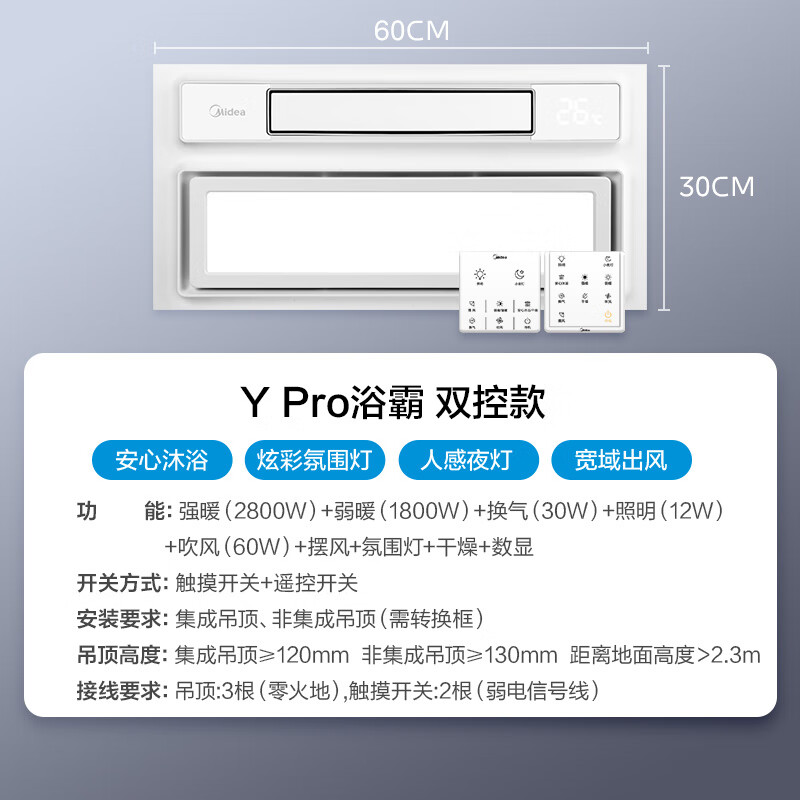 3、特别特别推荐!比传统浴霸好用,更节能。这个一定要推荐!有吹风唤气暖风灯多种功能,都是吹的舒服的风。特别小夜灯功能,全家人都超爱超爱的,不用动手开关,走进卫生间自动开启反应小夜灯!孩子特别喜欢晚上上卫生间不害怕了!暖风功能特别舒适不像传统浴霸头顶热!家里需要更好浴霸的推荐这款!