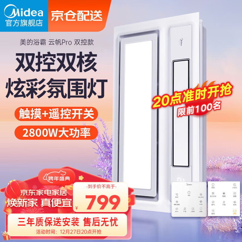 美的(Midea)风暖浴霸排气扇照明一体多功能暖风机卫生间集成吊顶云帆pro价格:849.00元!