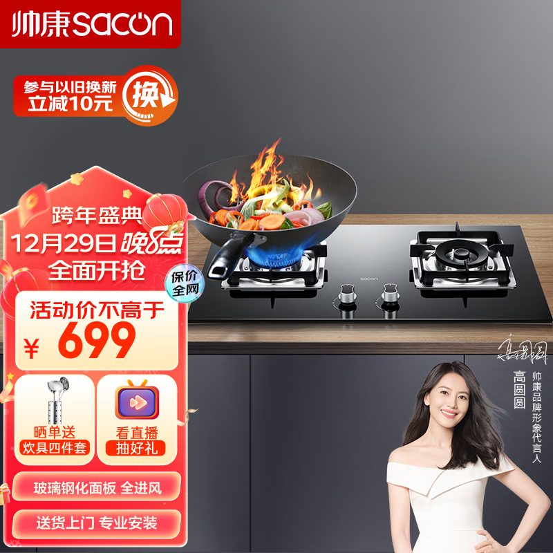 3、家里的燃气灶已经很老了,正好过年换新,换了一个燃气灶,家里人选来选去,就选了帅康的这款,配送速度很快,一周就到了,上门安装也很及时,玻璃的页面看着清爽,5.0的效率大火力烧起来很省劲。