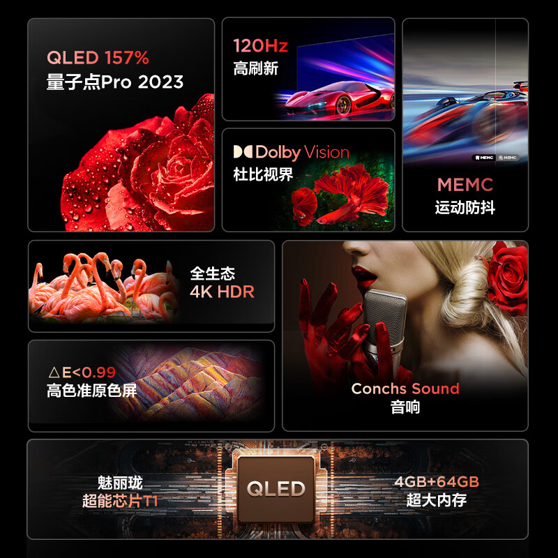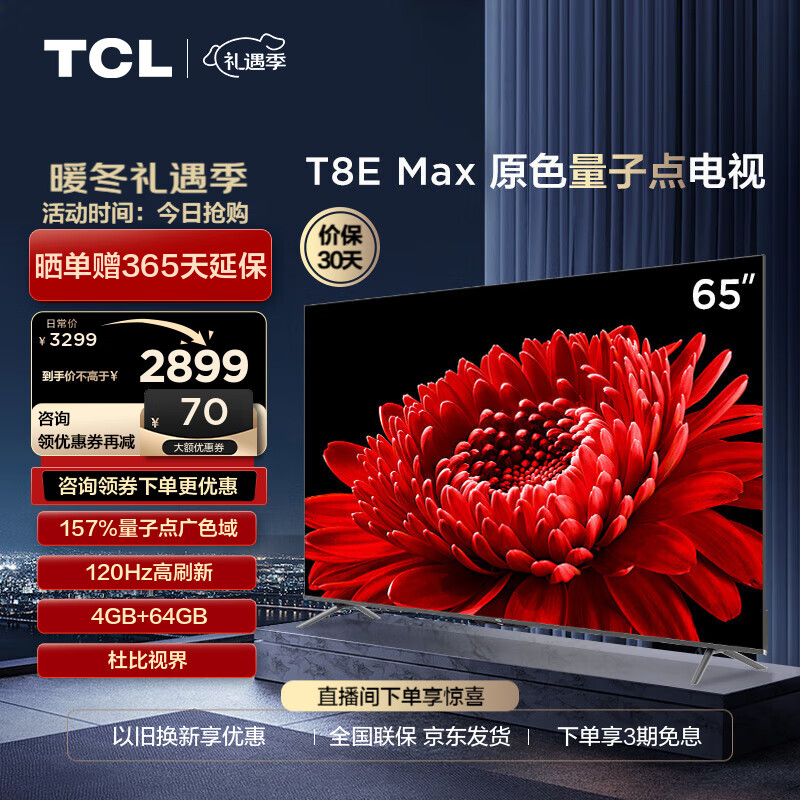 TCL电视 65T8E Max 65英寸 2023款全新升级 QLED量子点 120Hz MEMC 4+64G 平板电视机 以旧换新价格:2899.00元!
