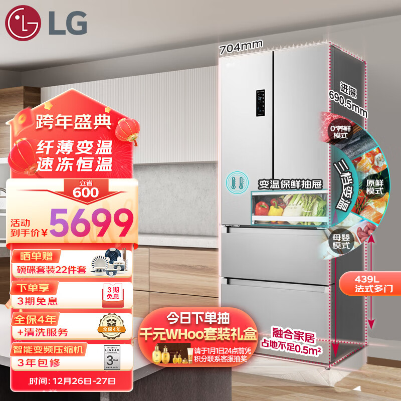 LG 439升 法式多门超薄大容量变温冰箱 纤巧机身 分类存鲜 变温调节 多重冷流 星光银 M422MHS17B价格:6299.00元!