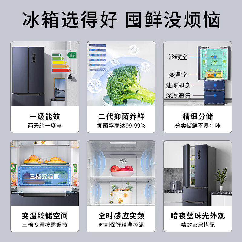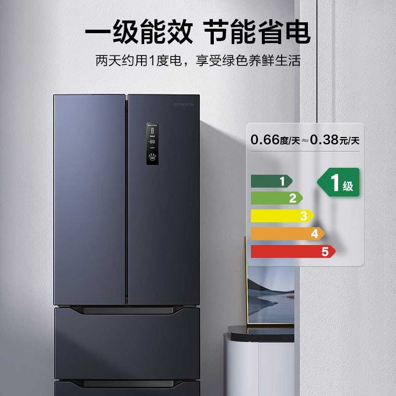 创维(SKYWORTH)【四维鲜净系列】331升风冷无霜一级能效双变频法式多门电冰箱暗夜蓝WM33BPS以旧换新价格:1999.00元!