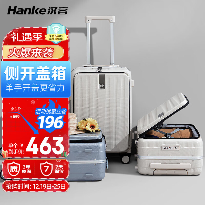 汉客行李箱男拉杆箱女旅行箱69升大容量24英寸象牙白镇店前侧开盖铝框价格:639.00元!