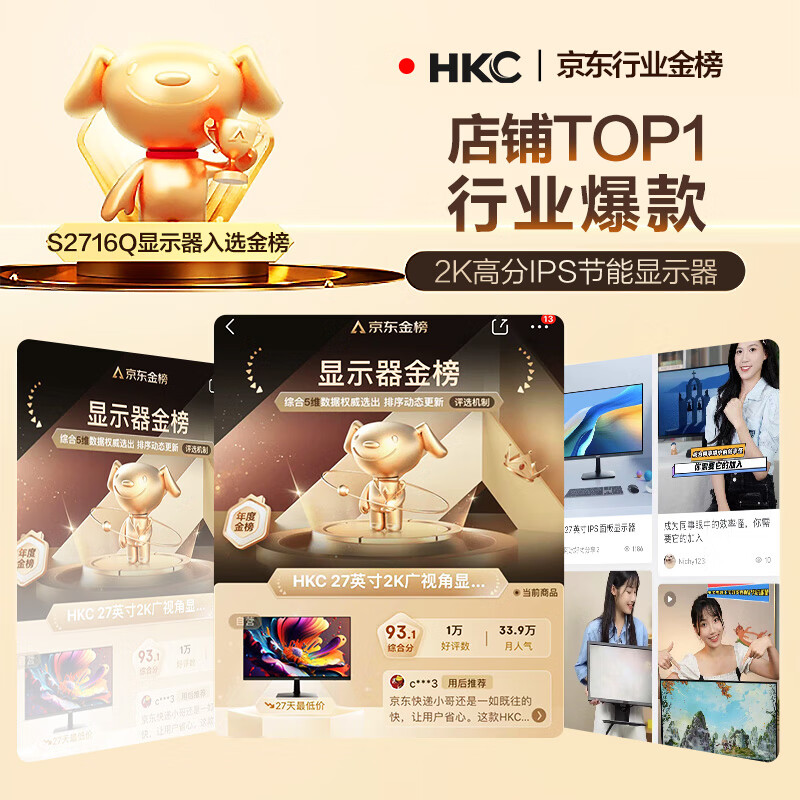 HKC 27英寸 IPS面板 显示器2K 低蓝光不闪屏 广视角 HDMI接口 可壁挂 家用办公液晶电脑显示屏S2716Q价格:999.00元!