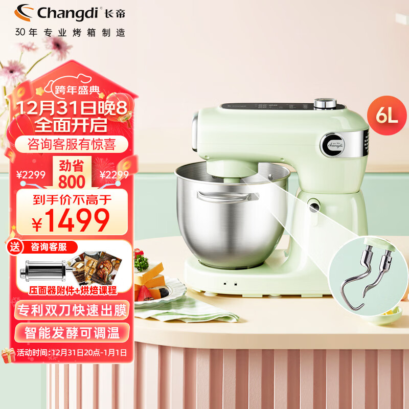 长帝(changdi)家用厨师机多功能和面机 双刀全自动揉面机 顶部大屏触控 直流电机轻音面包机 C6小奶猪价格:1699.00元!