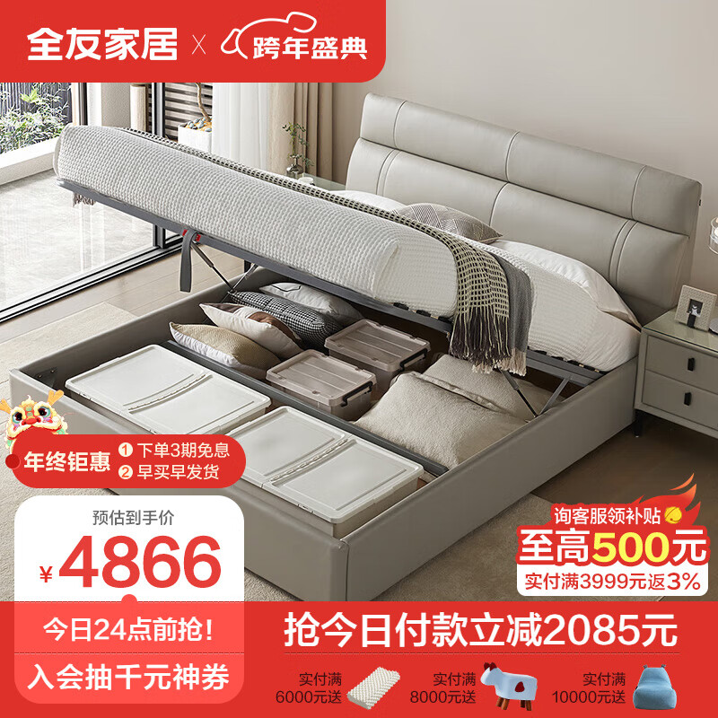 全友家居 进口头层皮双人床现代简约1.8米主卧皮床储物高箱床105251A价格:6951.00元!