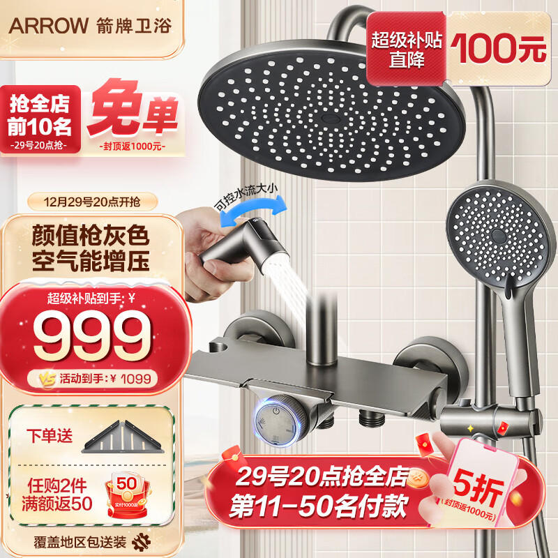 箭牌(ARROW) 淋浴花洒套装 枪灰色四功能莲蓬头花洒空气能增压置物平板花洒 枪灰色四功能花洒34125GG价格:999.00元!