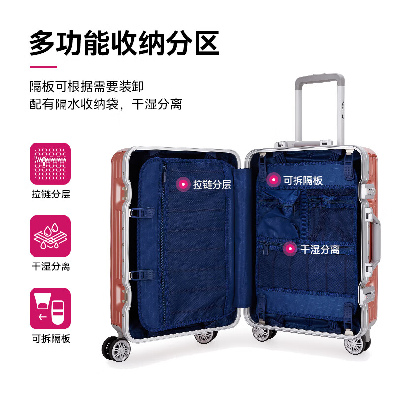5、送货非常快,昨晚订今天上午就收到了.箱子外观很美而且能放很多东西里面的隔层设计很好.值得推荐??滚轮滑度:360度转动非常方便做工质量:好??