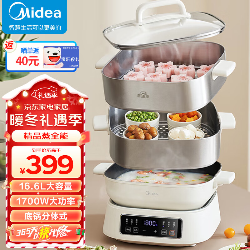 美的(Midea)电蒸锅 电煮锅 电火锅 多功能锅家用电锅蒸包子锅蒸全能三层大容量多用途锅 ZGC282802价格:399.00元!