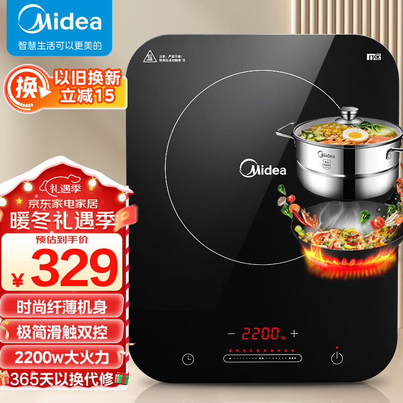 美的(Midea)电磁炉 家用大功率 2200W 恒匀火技术 智能断电 微晶面板 C22-WH2237(配汤蒸锅+渗氮炒锅)价格:389.00元!