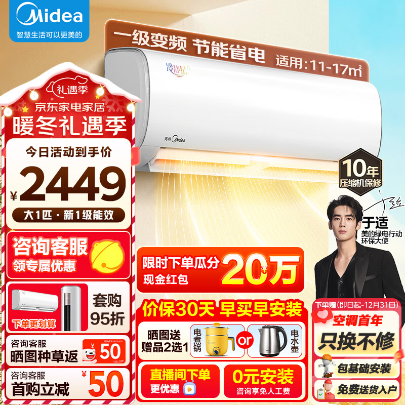 美的(Midea)空调大1匹挂机 冷静星二代 新一级能效 变频冷暖 壁挂式 KFR-26GW/BDN8Y-PH200(1)A 卧室书房空调价格:2499.00元!