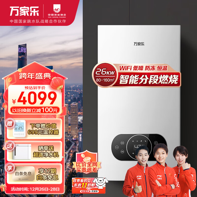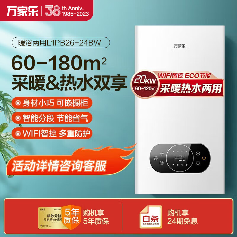 万家乐壁挂炉 洗浴采暖两用 燃气热水器 暖气片地暖 WIFI智控 分段燃烧26KW天然气BW【80-160平】价格:4098.00元!