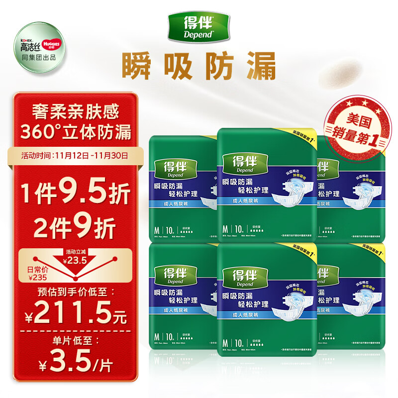 得伴Depend成人纸尿裤 臀围80-105cm M60片 成人纸尿裤老年 尿不湿价格:230.00元!