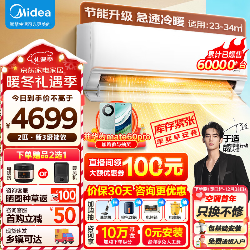 美的(Midea)空调2匹挂机 新三级能效 变频冷暖 节能省电 自清洁 壁挂式 大风量 KFR-50GW/G2-3 客厅商铺空调价格:4699.00元!
