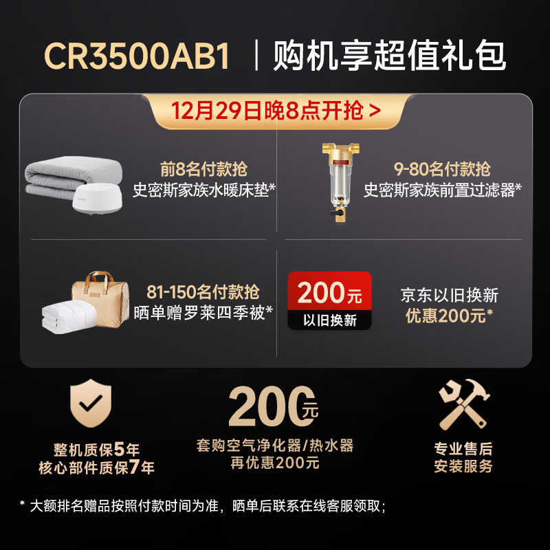给大家分享下!实实在在的说这款史密斯CR3500AB1外观我比较的喜欢,质量非常的好,很好哦新款机器完美嵌入师傅很负责技术很好试用下来水速水质都很完美选了这款因为滤芯不用经常更换很省心监控可以显示是否需要更换滤芯静音