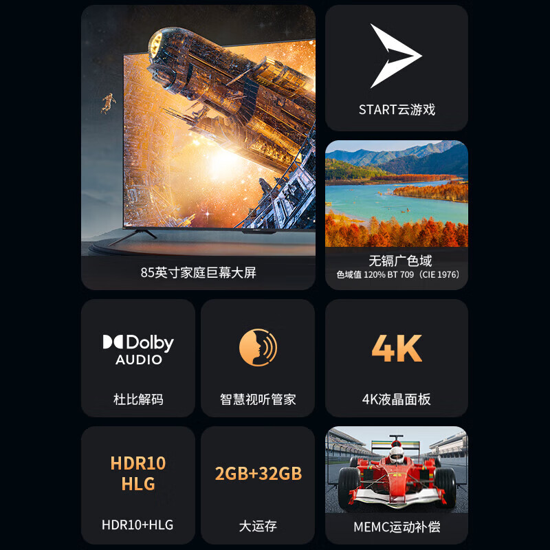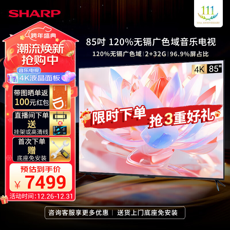 SHARP夏普4T-M85Q3EA 85英寸 120%无镉广色域 2+32G MEMC运动补偿 96.9%屏占比 HDR10+HLG 智能平板电视价格:7499.00元!
