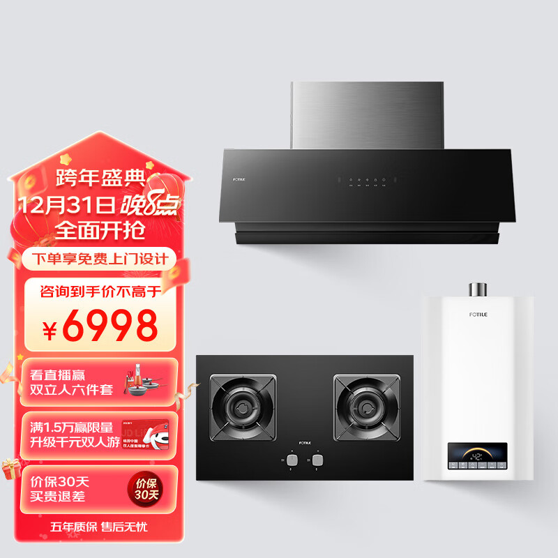方太(FOTILE)烟灶热厨房多件套 22大风量嵌平橱柜烟机4.5KW猛火灶 16升水伺服恒温燃气热水器JCD7A+TH27B+S16D1价格:6998.00元!