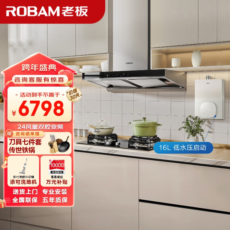 老板(Robam)烟灶热厨房多件套24风量欧式双腔变频大吸力吸油烟机灶具16升燃气热水器60D3S+57B2DT+HT322A-16价格:6798.00元!