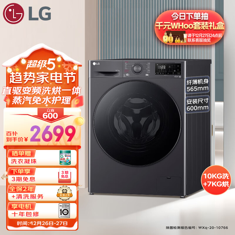 LG 星云黑 超薄洗烘一体机 10KG大容量滚筒自动洗衣机家用 蒸汽除菌 AIDD直驱变频 黑FCY10R4M价格:2699.00元!