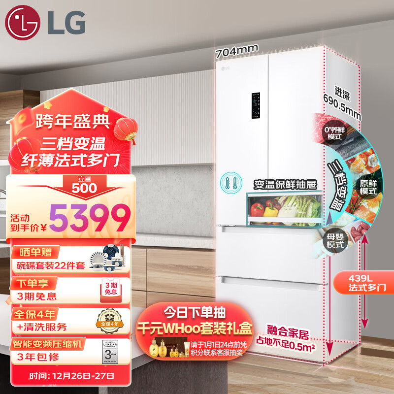 LG 439升 法式多门超薄大容量变温冰箱 纤巧机身 分类存鲜 变温调节 多重冷流 奶油白 M422MHT13B价格:5899.00元!