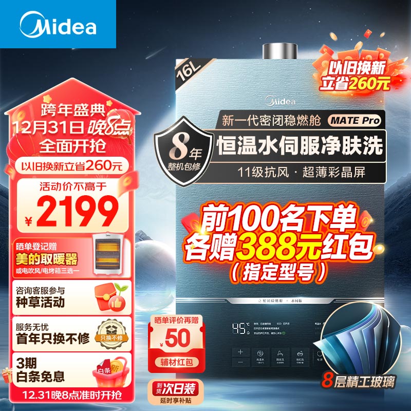 美的(Midea)16升燃气热水器 天然气 增压水伺服恒温 下置风机? 彩晶屏 新一代密闭稳燃舱 JSQ30-MATE Pro尘隐价格:2199.00元!