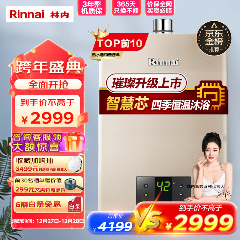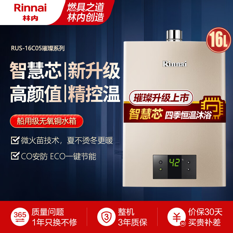 林内(Rinnai)璀璨系列16升燃气热水器 升级智慧芯 水气双调 天然气12T RUS-16QC05(JSQ31-C05)价格:2999.00元!