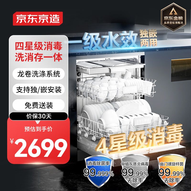 京东京造16套嵌入式大容量洗碗机家用洗消一体 超一级水效四星消毒分层洗热风烘干嵌入式独立式两用价格:2899.00元!