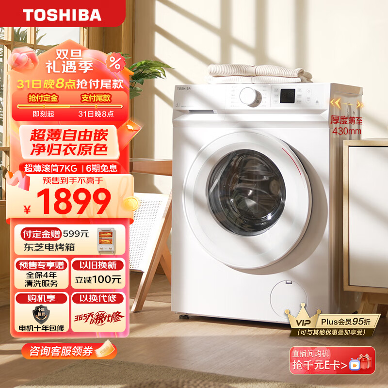 东芝(TOSHIBA)滚筒洗衣机全自动 超薄自由嵌 变频电机 7公斤超薄洗衣机 巨浪洗护色护形 以旧换新 DG-7T11B价格:1899.00元!
