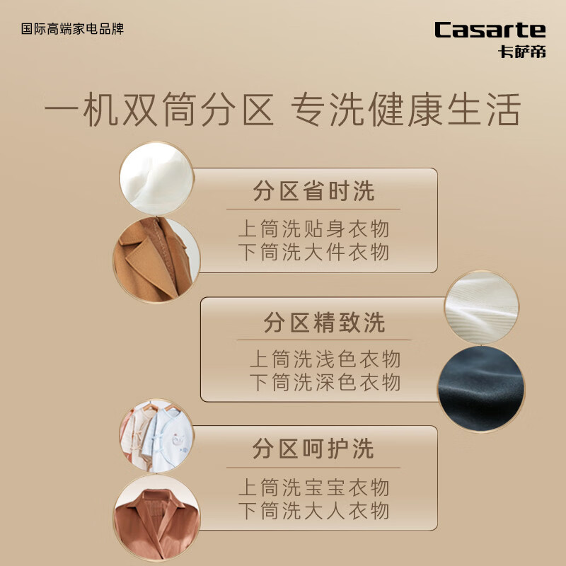 3、卡萨帝这款洗衣机非常好,极大的满足了我们家人对洗衣机的分类需求,小件用小筒,大件用大筒。干净、卫生、快捷;声音也轻。手动五星好评。