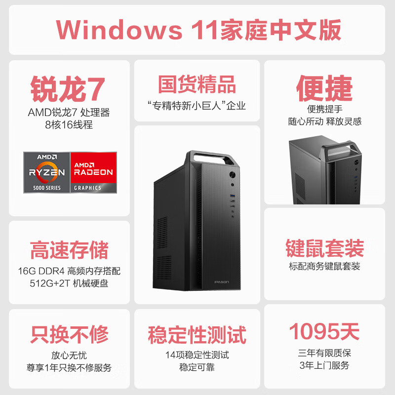 攀升 商睿2Pro 设计师办公商用台式电脑主机(AMD锐龙R7-5700G 16G 512GSSD+2TB 商务键鼠)价格:3599.00元!