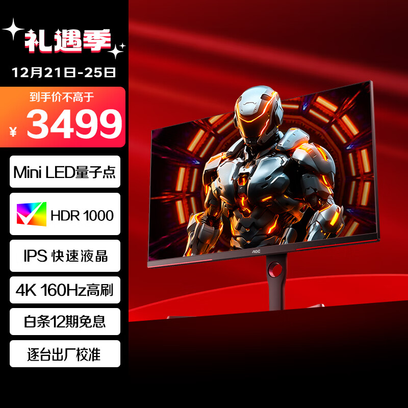 AOC 27英寸 4K QD量子点-MiniLED 2304颗LED 160Hz HDR1000 IPS快速液晶1ms 游戏电竞电脑显示器 U27G3XM价格:4499.00元!