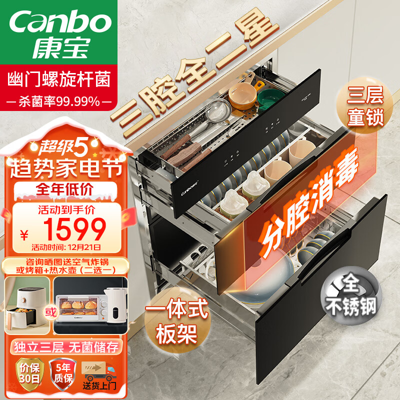 康宝(Canbo)三门三层不锈钢 磐石 消毒柜 嵌入式 家用 大升数紫外线高温二星厨房碗筷餐具消毒碗柜 XDZ100-ONE价格:1599.00元!