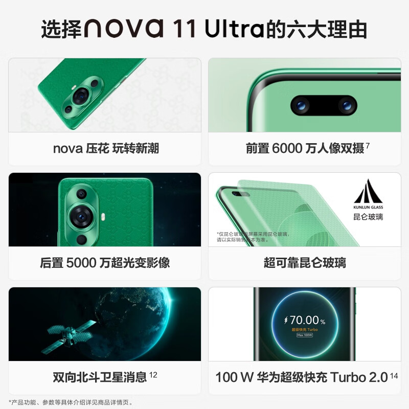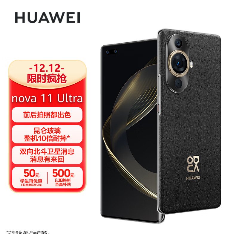 HUAWEI nova 11 Ultra 超可靠昆仑玻璃 前置6000万人像双摄 512GB 曜金黑 华为鸿蒙智能手机价格:4449.00元!