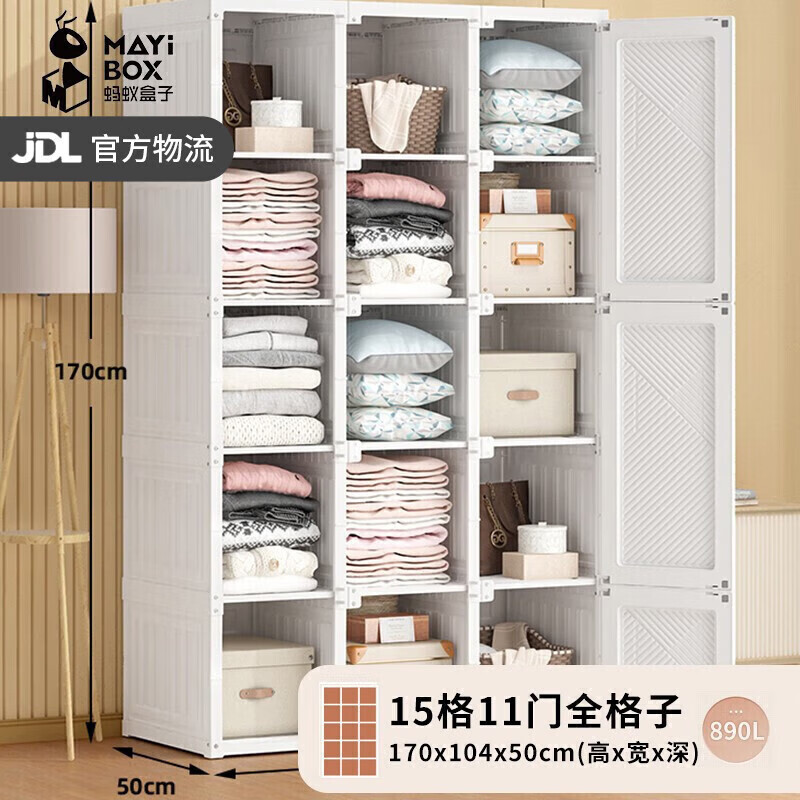 蚂蚁盒子(MAYIHEZI)免安装简易衣柜家用卧室出租房收纳衣橱 白板15格11门全格子价格:669.00元!