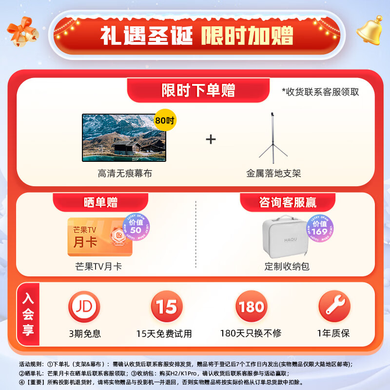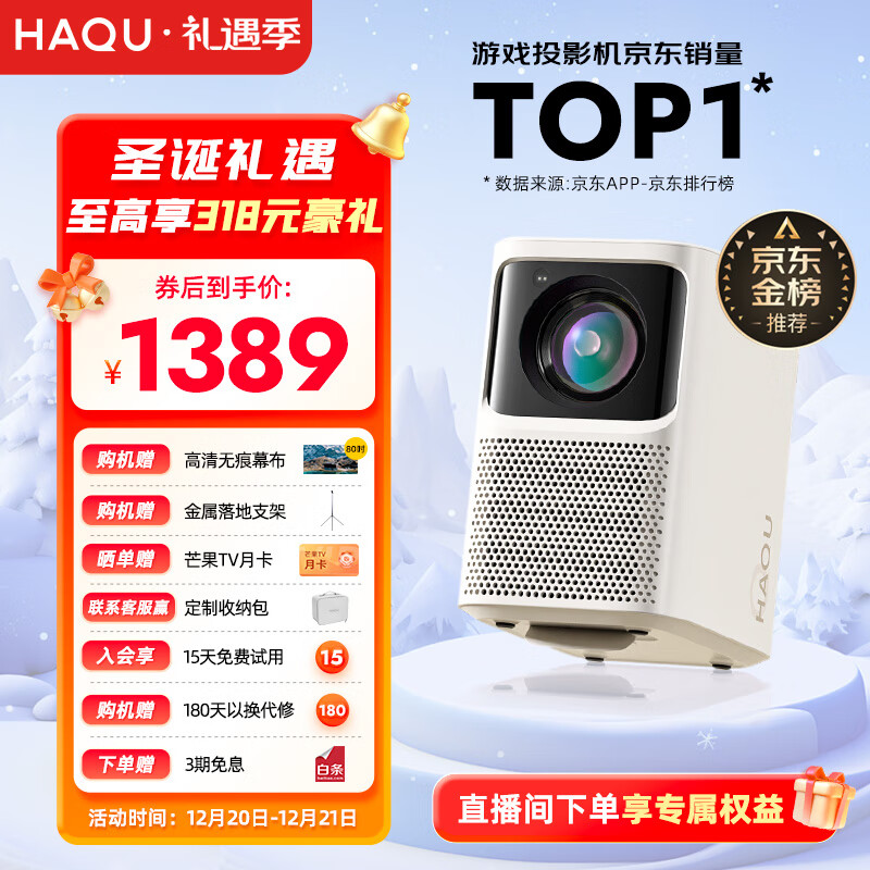 哈趣 K1 Pro 投影仪家用 游戏投影机 超清家用卧室投影机(500 CVIA流明 TOF无感对焦 无感自动梯形校正)价格:1399.00元!