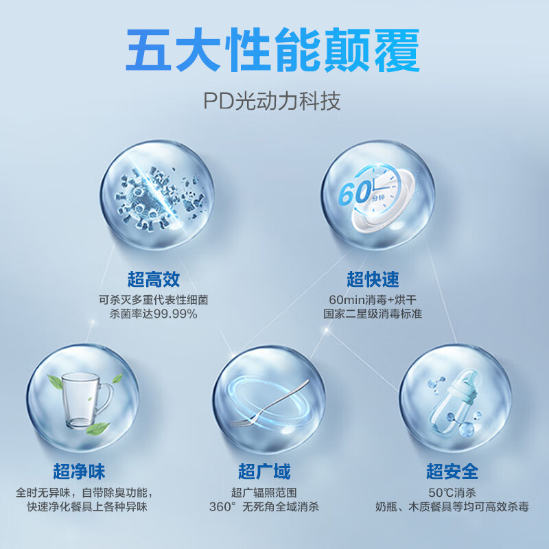 1、使用了一段时间来评价。这款消毒柜不错,消毒碗筷方便,空间够大。上面还有一层独立放筷子调羹的空间消毒,因为担心臭氧泄露,专门选择了这一款。